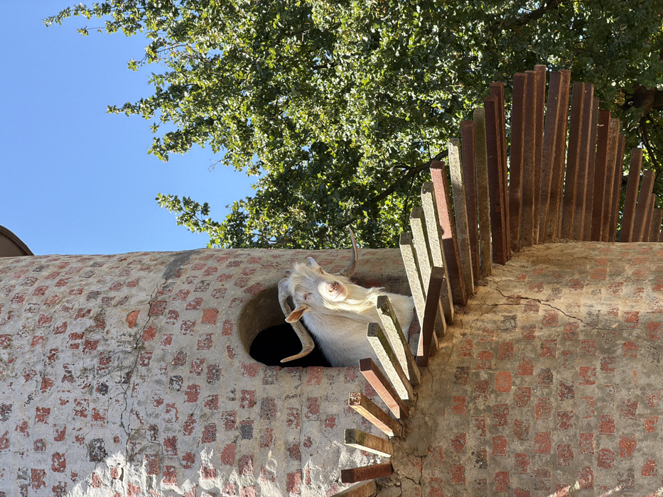 - "A white goat, characterized by long white fur, a prominent beard, and distinct curved horns, is observed emerging from a rounded archway in a weathered cylindrical brick tower" by FM-tYDL83, licensed under CC BY 4.0