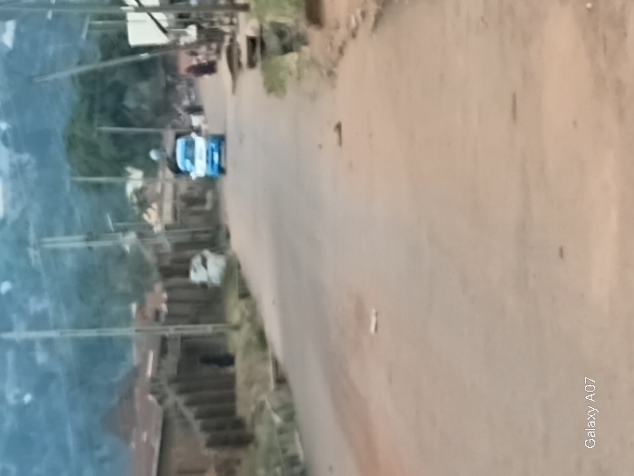 The image depicts a street scene in Ankpa, Nigeria, characterized by an unpaved or poorly maintained light brown road extending into the distance. In the middle ground, a light blue and white minivan or small bus is visible, driving away from the viewer. On both sides of the road, single-story structures with reddish-brown walls and dark roofs are present. Utility poles with overhead wires run along both sides of the thoroughfare. Several indistinct human figures are visible on the sides of the road in the distance, some appearing to be walking or standing. Drainage ditches or gutters run parallel to the road on the left and right. The background features lush green hills or mountains, indicative of a natural, elevated landscape. The overall lighting is diffuse, suggesting daylight conditions. The image bears a "Galaxy A07" watermark in the bottom left corner.