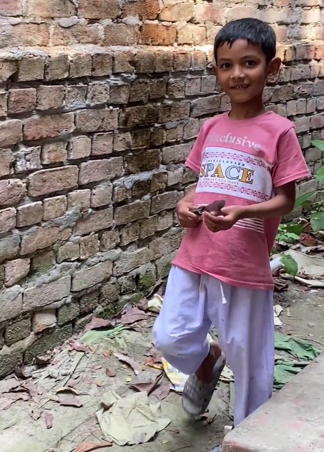 A young boy is walking and smiling towards the camera. He is wearing a pink t-shirt, white pants, and sandals. In his hands, he holds a small knife. He walks along a pathway adjacent to a brick wall, with litter scattered on the ground around him. The background suggests an urban or semi-urban environment.