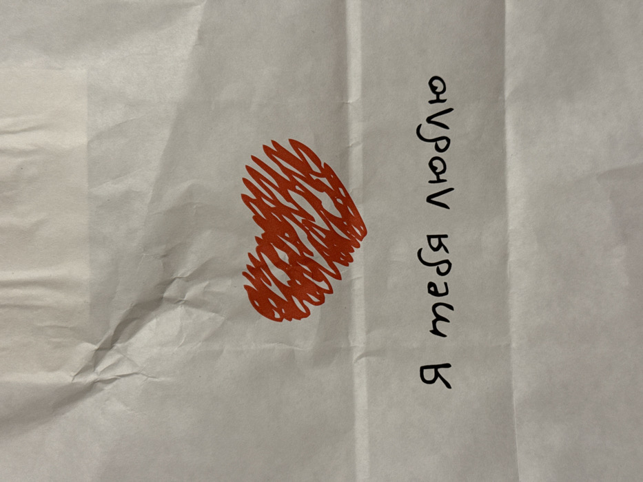 A white, slightly wrinkled piece of paper features a scribbled red heart on the left