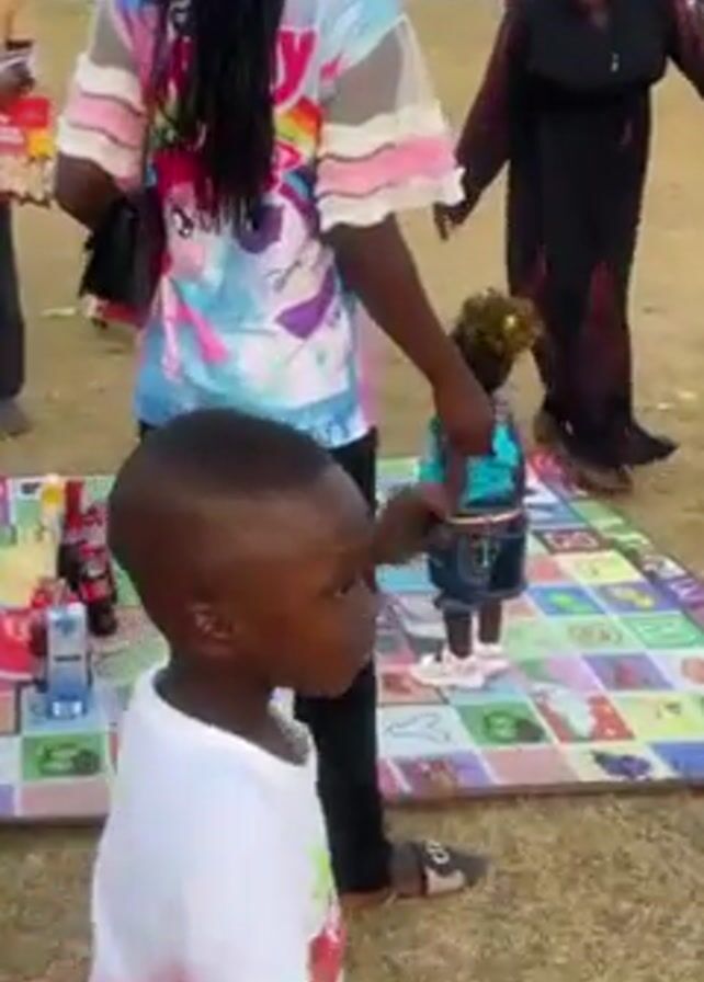 The scene takes place in a grassy, outdoor area with several people gathered. A child in a white shirt and grey pants is standing near a woman wearing a My Little Pony-themed shirt and dark pants. A colorful picnic blanket with an ABC pattern lies on the ground, with some items placed on it. A woman in a long black dress appears to be interacting with the other two figures. A small child with curly blondish hair wearing a blue top and jean shorts is also present. A man in a traditional outfit holding multiple bags of snacks is standing in the background. Power lines are visible in the distance.