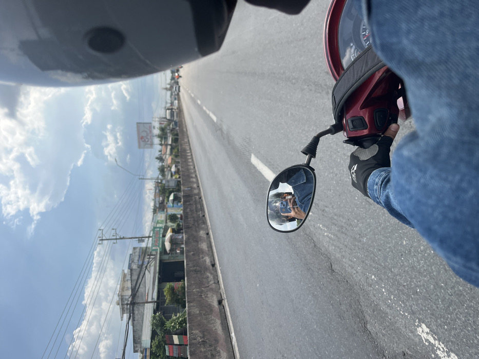 A first-person perspective captures a motorcycle ride on a highway. A rider's gloved hand grips the handlebar, and a side mirror reflects the driver taking a selfie with a phone. The scene shows a concrete road, a roadside view of buildings, power lines, and a cloudy sky. The rider wears a helmet, visible at the top of the frame, and a denim jacket. A speedometer is visible.
