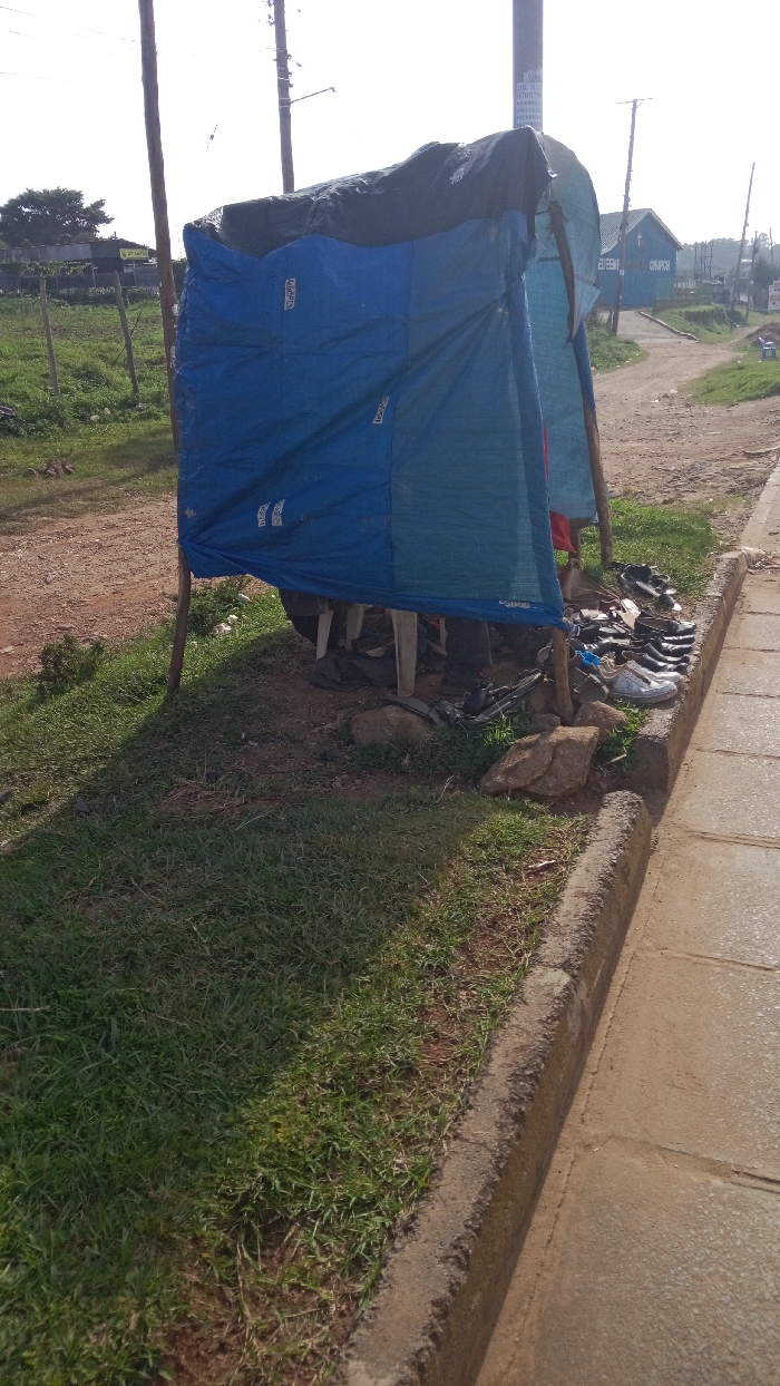 A makeshift structure stands on a grassy patch beside a sidewalk. It is crudely built with a blue and black tarp stretched over wooden poles. Underneath, chairs are visible, along with what appears to be a collection of shoes displayed for sale. The sidewalk borders the grass, extending into the distance towards a road. In the background, utility poles and a building with the word "Church" are visible. The scene appears to be in a rural or suburban area.