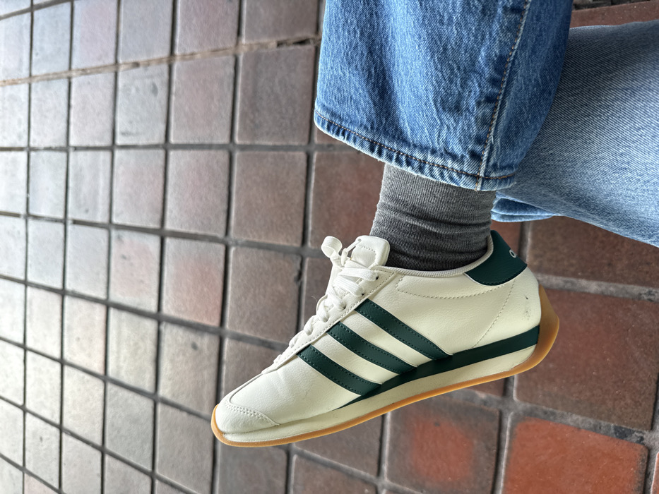 A person wears blue denim jeans with a cuffed hem, gray socks, and a white Adidas sneaker featuring dark green stripes. The shoe has a gum sole and white laces. The person is positioned on a tiled surface, comprised of light and dark brown squares. The camera angle is slightly elevated, capturing a close-up view of the lower portion of the body.