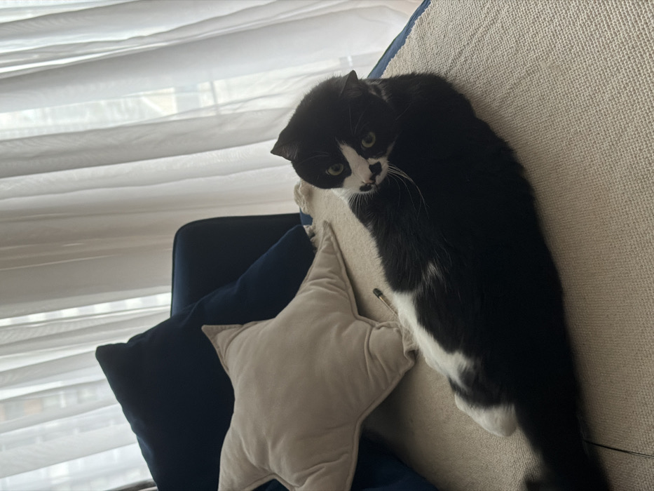 The scene depicts an indoor residential or hotel environment in Belgrade, Serbia. The exact location within the city cannot be determined from the visual evidence. A black and white domestic cat is the primary subject, resting on its left side on a light-colored, textured upholstered surface, likely a sofa arm or chaise lounge. The cat exhibits a white face with distinct black markings, including a 'mustache' pattern above its mouth and a black patch around its right eye. Its body is predominantly black with a white belly and white front paws. The cat's ears are folded, characteristic of a Scottish Fold breed. Its green eyes are wide open and directed towards the viewer. Behind the cat, a dark blue upholstered sofa or chair is visible, supporting a light beige, five-pointed star-shaped cushion. A slender, dark object, possibly a pen or small stick, lies on the textured surface adjacent to the cushion. The background reveals a window covered by sheer white curtains, allowing diffused light into the room. Faint outlines of an urban structure or balcony can be discerned through the curtains. No human subjects are present.