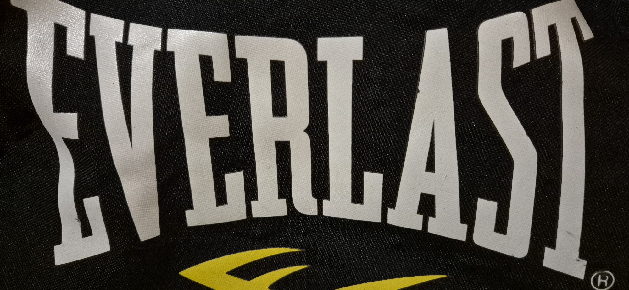 The scene is located in the city of Ivailo, Bulgaria. The image presents a detailed, close-up view of a black, woven textile material. Centered within the frame, the word "EVERLAST" is displayed in large, white, uppercase letters, exhibiting a slight upward arch. The texture of the black fabric is discernible, indicating a fine, synthetic weave pattern. Below the "EVERLAST" text, a partial yellow graphic, characterized by sharp, angular points, is visible, primarily beneath the 'ERLAST' section. No individuals, actions, or direct interactions are present; the sole focus is on the branded fabric.
