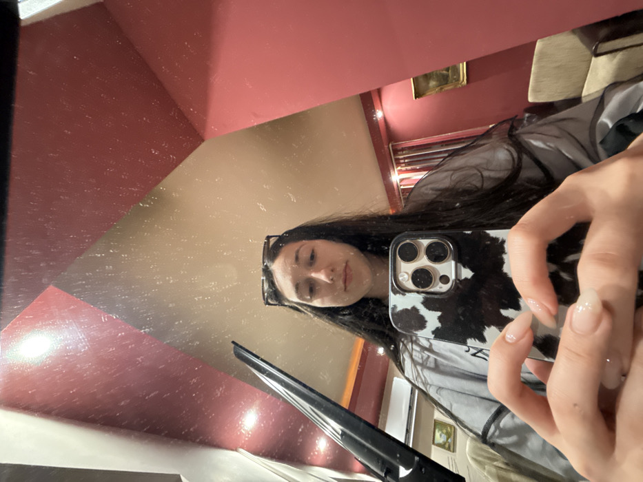 The image depicts a mirror selfie taken by a female in Galabovtsi, Bulgaria. The female, with long dark hair and dark-rimmed glasses resting on top of her head, is holding a smartphone with a black and white cow-print case. Her hands, adorned with light-colored, manicured fingernails, are visible in the lower foreground, gripping the device. She is wearing a gray garment, possibly a jacket or top. The reflection reveals an interior space with walls painted in contrasting sections of maroon/red and beige/light brown. Angular architectural features are visible, particularly in the ceiling and wall junctions. Overhead lighting sources are reflected as bright spots on the mirror's surface, which appears to have minor dust or speckling. In the background, visible through the reflection, are several objects. To the left, a dark, angled structure, possibly a screen or part of a fixture, is present. Below it, a light-colored piece of furniture and a framed painting with a gold border are discernible. To the right, red curtains hang, and a light-colored armchair is partially visible.