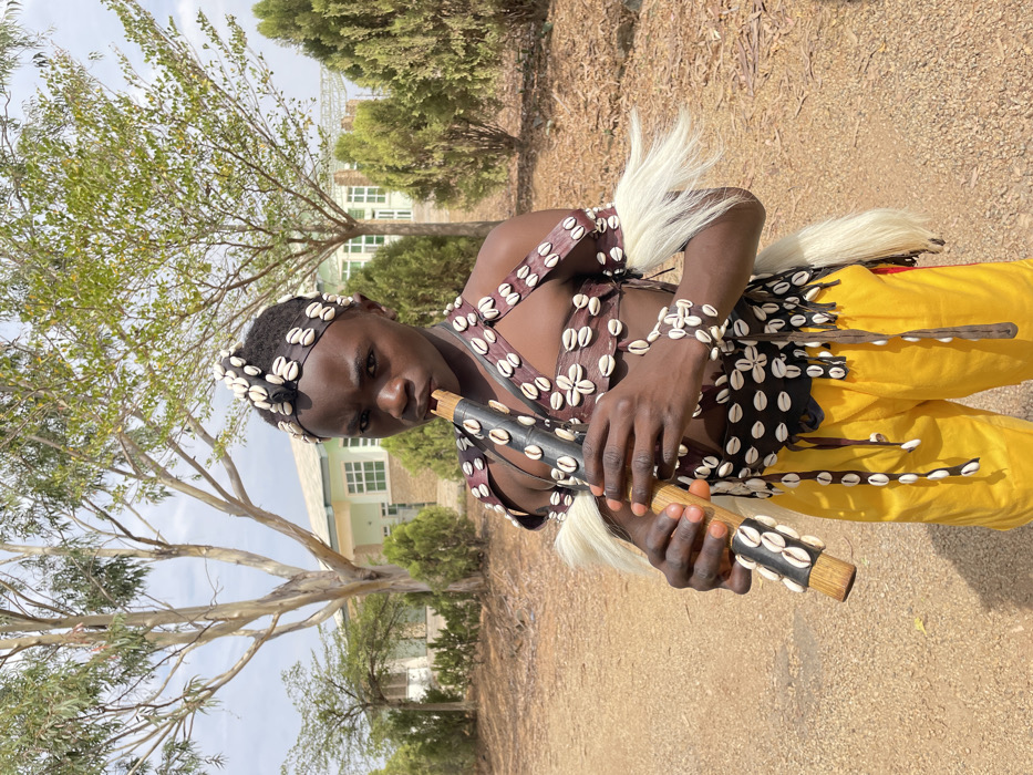 A young individual stands outdoors in Nabatum, Nigeria, centrally positioned and facing the camera while holding a two-toned wooden flute to their mouth