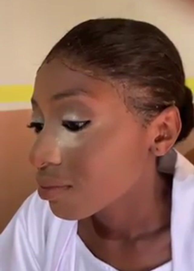 A medium shot depicts a young woman with dark brown hair pulled back into a bun. She is wearing a white collared shirt. Her skin appears dark, and she has makeup on. There is a light, possibly white or shimmery, substance under her eyes. She is looking slightly off-camera, with her gaze directed to the left. The background consists of a light-colored wall. A yellow stripe is visible on the wall near the top. The scene appears to be indoors. There is background noise of a person talking.