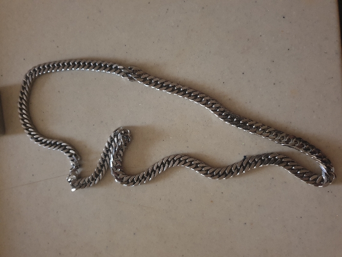 - "One silver-colored, curb-link chain is displayed on a light beige, textured surface" by FM-wMtmI3, licensed under CC BY 4.0