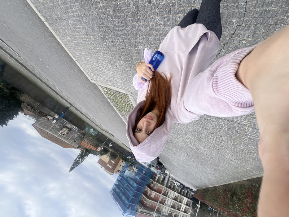 A young adult female is depicted in a high-angle, tilted selfie. She wears a light purple hooded sweatshirt with the hood up, revealing long, reddish-brown hair, and dark grey leggings. A gold-colored bracelet is on her right wrist. She holds a blue water bottle and a light purple cloth in her right hand, while her left arm is extended towards the camera. The subject stands on a grey cobblestone sidewalk adjacent to an asphalt road. To her left, a multi-story building under construction is partially obscured by blue scaffolding. Further in the background, vehicles are parked along the street. Across the road, an aged two-story building with a red tile roof and weathered facade stands next to a prominent, tall coniferous tree. Additional buildings and vegetation are visible in the distance. The sky is overcast. A low-lying hedge with red foliage borders the sidewalk in the foreground. The scene is an urban streetscape within an unspecified city.