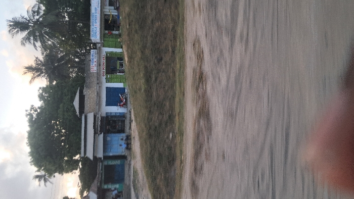 A street scene showcases a single-story building with various signs including "Golden Groceries Cereals & Spice Shop." A red motorbike is parked nearby. Lush green vegetation lines the road, leading to a sandy or dirt road. The sky is partially obscured by trees, with hints of a sunset. The image's orientation is sideways. A blurry, human object is visible on the right side.