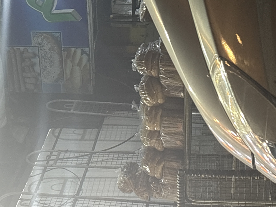 This image depicts an exterior view of a commercial establishment, likely a bakery or a shop selling baked goods, located in Al-Qadam Municipality, Syria. The foreground, positioned in the lower right, shows the light-colored hood and headlight area of a vehicle, partially obscuring the scene. The midground features a metal display rack holding numerous baked goods. These items, primarily round loaves of bread or buns, are individually wrapped in clear plastic bags. They are stacked in multiple columns, with some stacks appearing to have a larger, cylindrical, plastic-wrapped item at their base. Behind this display, a light-colored, gridded metal structure, possibly a security gate or part of a building facade, is visible. In the upper right quadrant, a blue sign with white and green text and images is displayed. The sign features photographic representations of various baked products: elongated items (possibly breadsticks), a large round bread item topped with sesame seeds, and a pile of smaller bread rolls. A stylized green Arabic letter, possibly "ر" or "R," is visible on the far right of the sign. The scene is illuminated, with some atmospheric haze or light diffusion evident. No individuals are visible within the frame.