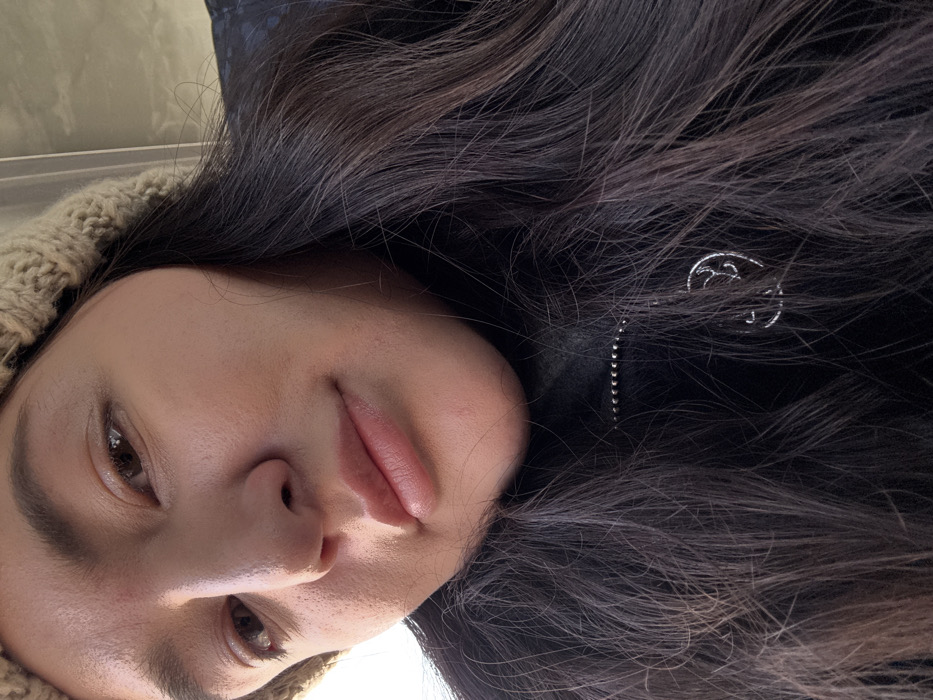 A close-up, low-angle portrait depicts a single female subject, presumably located in Yegoryevsk, Russia. The subject's head and upper torso are visible, with her face occupying the central and upper-left portions of the frame, angled towards the camera. **People:** One female individual is present. She has dark eyes, a small epidermal blemish on the upper forehead, and full lips exhibiting a slight sheen. **Subjects:** The primary subject is the woman's face. Her long, dark brown, wavy hair cascades over her shoulders and chest. **Objects:** She wears a light-colored (beige or cream) knitted beanie on her head, partially visible on the upper left. A dark-colored (appears black) jacket with a metallic zipper track is visible. On the left chest area of the jacket, a circular, silver-toned pendant or charm with an embossed, stylized emblem (resembling a capital 'G' or similar design) is visible, partially obscured by her hair. **Actions:** The subject is looking directly into the camera, consistent with a self-portrait or posed photograph. Her head is tilted to the left. **Interactions:** No interactions with other individuals are depicted. **Environment:** The background is largely out of focus. On the upper-left, an overexposed bright light source, possibly a window or an open sky, is visible. On the upper-right, a blurred, light-toned surface with subtle vertical textures suggests an indoor or semi-enclosed setting with natural light illumination. The lighting appears strong, casting illumination primarily from the subject's upper-left.