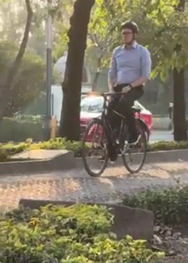 A man wearing a helmet, light blue collared shirt, and dark pants rides a black bicycle to the left on a paved street. The man is looking forward. A red car drives by in the opposite direction. The street has a concrete median with shrubbery and trees. There are several other trees and shrubs on the opposite side of the street. There are several people on a sidewalk on the other side of the street. A metal fence can be seen through the trees. The sun is shining. The camera appears to be filming from a table or countertop, and the arm of a chair can be seen in the lower left corner.