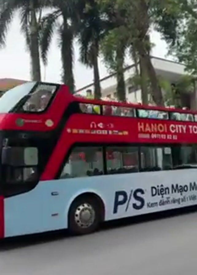 A double-decker bus, labeled "Hanoi City Tour," is seen on a street