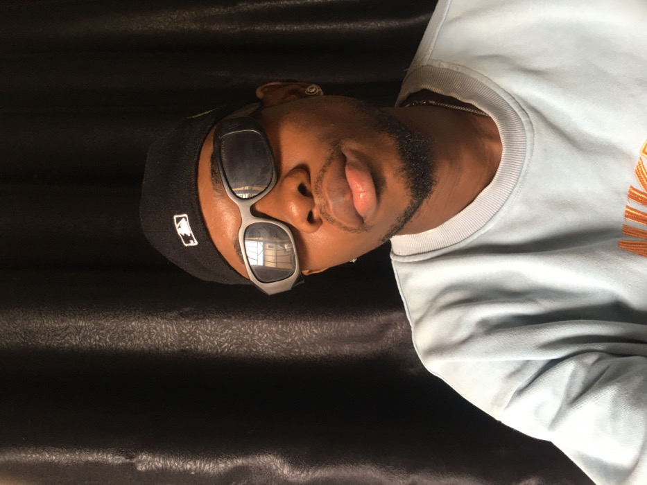 A male individual, of African descent, is depicted in a close-up, eye-level portrait against a dark, textured fabric background, likely a curtain. He wears a black beanie with a white rectangular logo, grey-framed wrap-around sunglasses that reflect an indoor structure on the left lens, and a light blue crewneck sweatshirt with an orange embroidered design visible on the lower right, possibly "NIKE". A silver chain is visible around his neck, and a silver stud earring is present in his left ear. He has a short, trimmed beard and mustache, and his lips are slightly pursed. The subject faces forward, looking directly into the camera. The specific location within Iranla, Nigeria, is not discernible from the provided visual evidence.