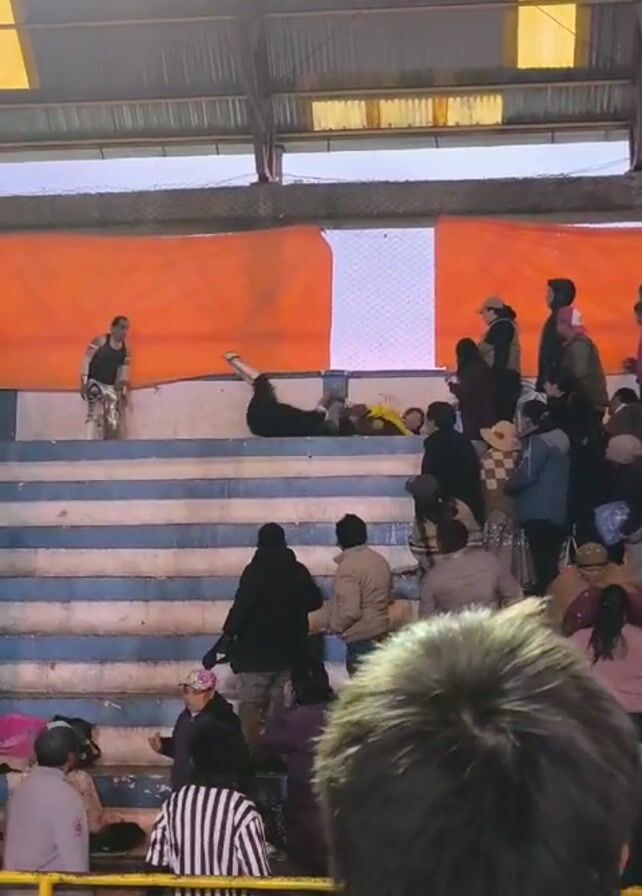 wrestling performance on a set of steps in front of an audience. A wrestler in shiny silver pants and no shirt stands above two others, one in a yellow dress and the other in dark clothing. The wrestler in dark clothing falls down several steps, while the other two remain standing on the higher steps. The audience watches the performance. The scene is in an indoor venue with a corrugated metal roof and walls painted with orange and white stripes.