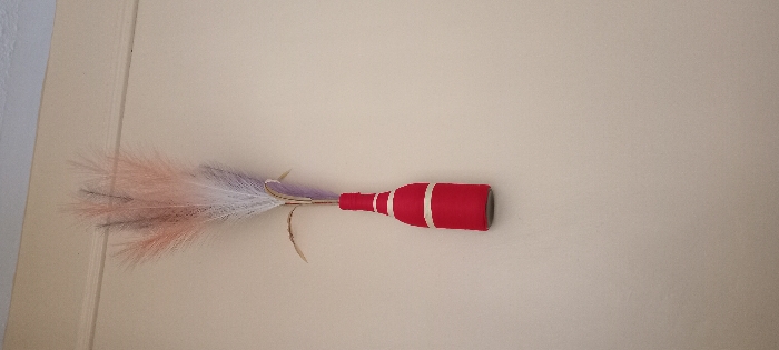 This image, taken in Kisumu, Kenya, displays a static interior scene. A decorative arrangement is centrally mounted against a uniform, light beige wall. The primary object is a repurposed bottle, painted solid red and adorned with two horizontal light-colored bands around its body, functioning as a vase. From the bottle's opening, a collection of artificial feathery plumes or grasses protrudes upwards, exhibiting colors primarily in light pink, white, and a subtle purple hue. Interspersed with these plumes are two slender, curved, artificial stalks or leaves in a light tan shade. A horizontal architectural trim or ceiling line is visible along the upper edge of the wall. No individuals or active interactions are depicted in the frame.