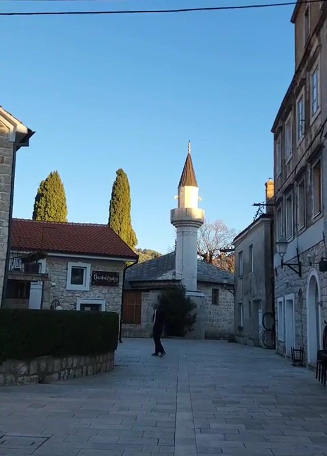 man walking across a stone paved square in a village setting. He is walking from left to right, away from the camera. He is wearing dark clothing. The square is surrounded by stone buildings with red tiled roofs. A minaret rises from one of the buildings. The sky is clear and blue with a sliver of a moon visible in the upper right corner. The village has an old, traditional look. There are power lines visible across the top of the scene.