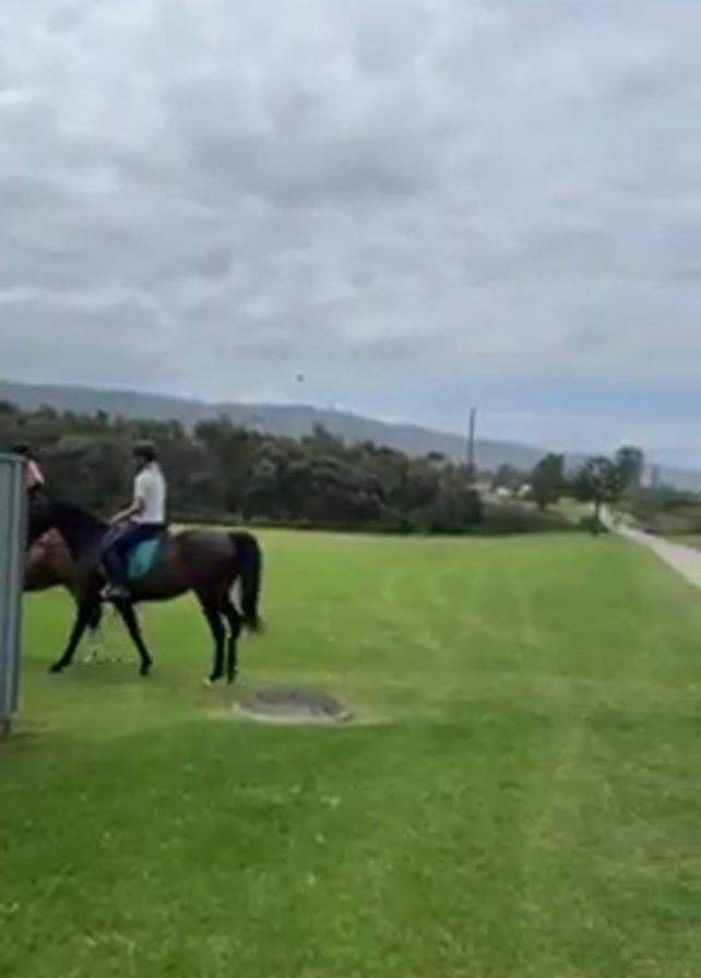 Two people are horseback riding on a green lawn near a grey building. In the background, there is a path with two people walking on it, leading towards a beach with breaking waves. The sky is overcast.