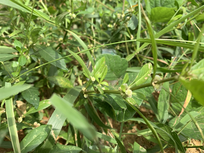 The image depicts a close-up, ground-level view of dense, uncultivated vegetation in Ikot Mbonde, Nigeria. The scene is dominated by various green plant species, including broad-leaved herbaceous plants with small, pale green or whitish globular inflorescences, and slender-bladed grasses. Some leaves exhibit minor imperfections such as small holes or slight discoloration. The underlying ground, visible intermittently through the foliage, appears to be light brown soil or sand. Natural light illuminates the scene, creating minimal shadows. No human subjects, animals (beyond potential microscopic life), or man-made objects are identifiable. The foliage occupies the entire frame, suggesting an overgrown natural environment.