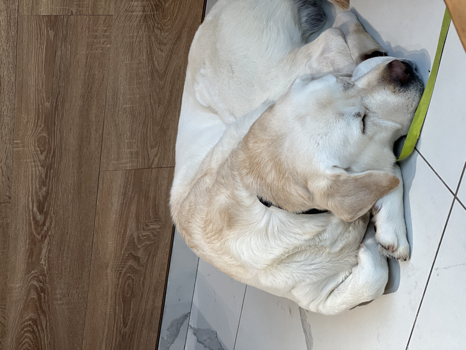 - "An indoor scene in Mytishchi, Russia, depicts a cream-colored Labrador Retriever dog sleeping, curled on its right side on a light-colored tiled floor" by FM-Vgo2F2, licensed under CC BY 4.0