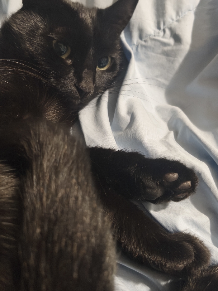 - "The image depicts a black domestic cat lying on a light blue fabric surface" by FM-QURhh1, licensed under CC BY 4.0