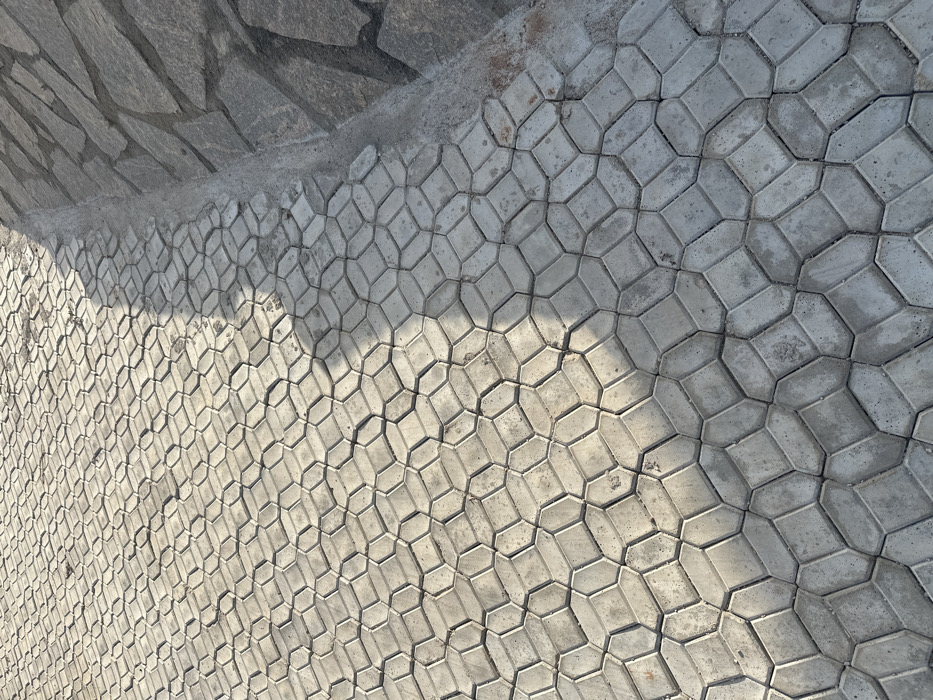 The image displays a patterned concrete surface, possibly a walkway or pavement, comprised of interlocking geometric shapes that resemble irregular hexagons