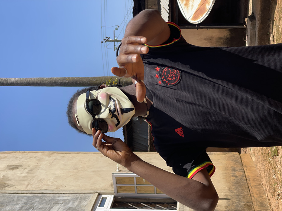 An individual is depicted outdoors in a sunlit environment within Jos, Nigeria. The person, wearing a black short-sleeved athletic shirt featuring a red Adidas logo and an "AJAX" crest with three red stars, also sports red, yellow, and green striped sleeve cuffs. A Guy Fawkes mask covers the face, topped by black hair, and black sunglasses are positioned over the mask's eyeholes. A necklace with white beads is visible. The left hand, wearing a silver ring, is raised, adjusting the sunglasses. The right arm is extended forward, with the index finger pointed towards the viewer, also bearing a silver ring. The background includes a light brown, possibly stucco-finished, building with a partially open white-framed window on the left. A tall, slender palm tree trunk stands centrally to the right of the individual. Further right, utility poles with wires are visible against a clear blue sky. In the lower right, a portion of a white satellite dish and a structure with a corrugated metal roof are present. The ground consists of bare, reddish-brown earth. The scene is illuminated by strong natural sunlight.