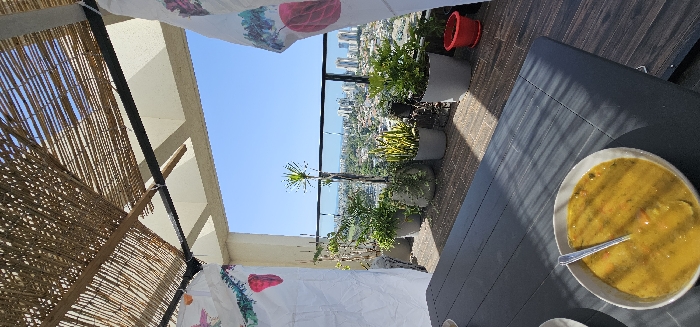 The image captures a rooftop patio or balcony scene in Rishon LeZion, Israel, under a clear blue sky. In the foreground, a dark grey rectangular table holds a white bowl containing a yellow-orange soup or stew with visible vegetable fragments and a silver spoon. Parallel striped shadows from an overhead structure are cast across the table and bowl. To the left, a white fabric panel, decorated with abstract red and green botanical patterns, hangs vertically from a light-colored structural pillar. Overhead, a bamboo or straw mat canopy is supported by wooden beams and black metal framework. The patio floor consists of dark wooden decking. A series of potted plants, primarily in grey and one red pot, line the perimeter along a glass and metal railing. Beyond the railing, a wide vista of the city of Rishon LeZion extends to the horizon, featuring numerous buildings and green spaces, with a faint haze indicating the distant Mediterranean Sea. No individuals are present.