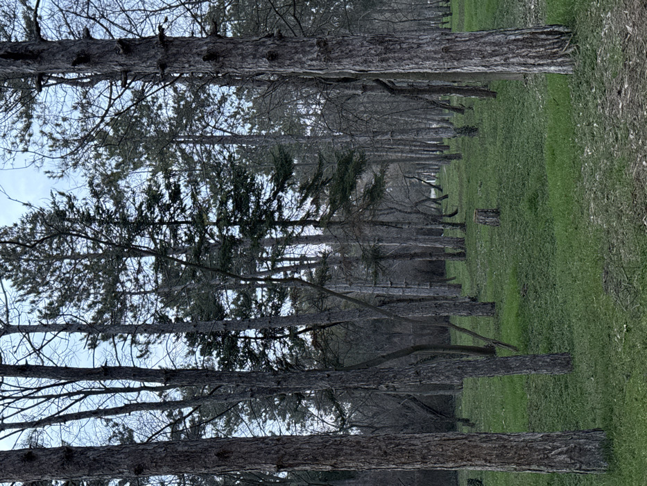 The image depicts a ground-level view within a park or wooded area located in Dobrich, Bulgaria. The scene is populated by numerous tall, slender trees, predominantly coniferous with some discernible dark green needles in their upper sections, intermingled with deciduous trees exhibiting bare, intricate branch structures. The tree trunks are characterized by grey-brown, textured bark. The ground is uniformly covered with vibrant, short green grass. In the midground, two tree stumps are visible: one centrally positioned slightly left of the frame, and another further to the right. The trees form a natural, receding corridor or pathway through the center of the image. The sky, visible through the upper tree canopy, is overcast and appears as a light blue-grey. No individuals, animals, or active events are present within the frame.