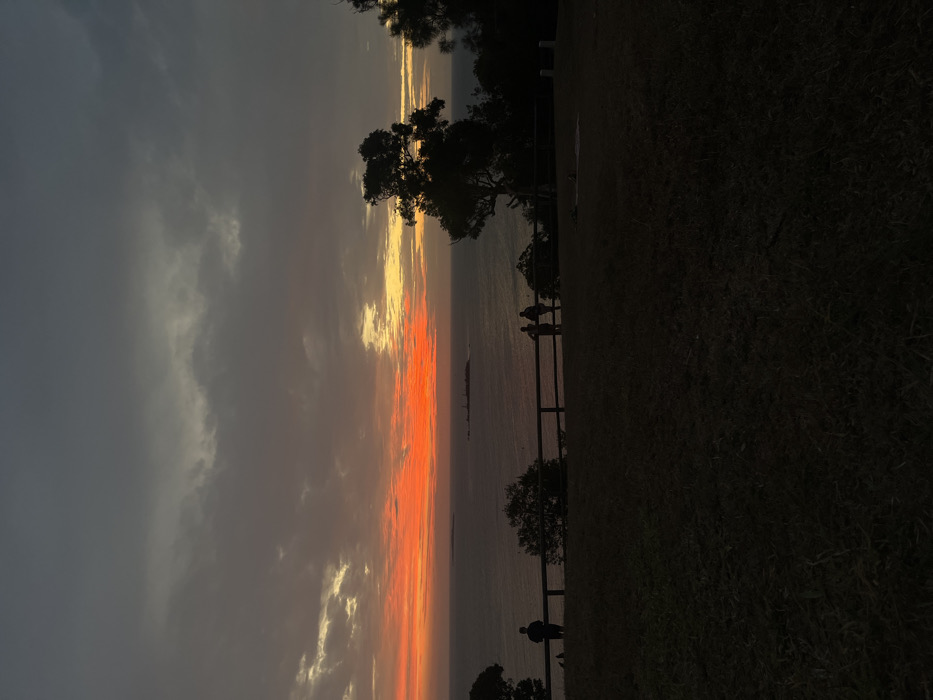 An orange and yellow sunset dominates the sky above a dark ocean. A grassy hill stretches across the right side of the image, where a wooden fence overlooks the water. Silhouetted figures stand near the fence, appearing to watch the sunset. Dark trees frame the water's edge. The left side of the sky is filled with grey, cloudy patches, contrasting with the bright sunset colors.