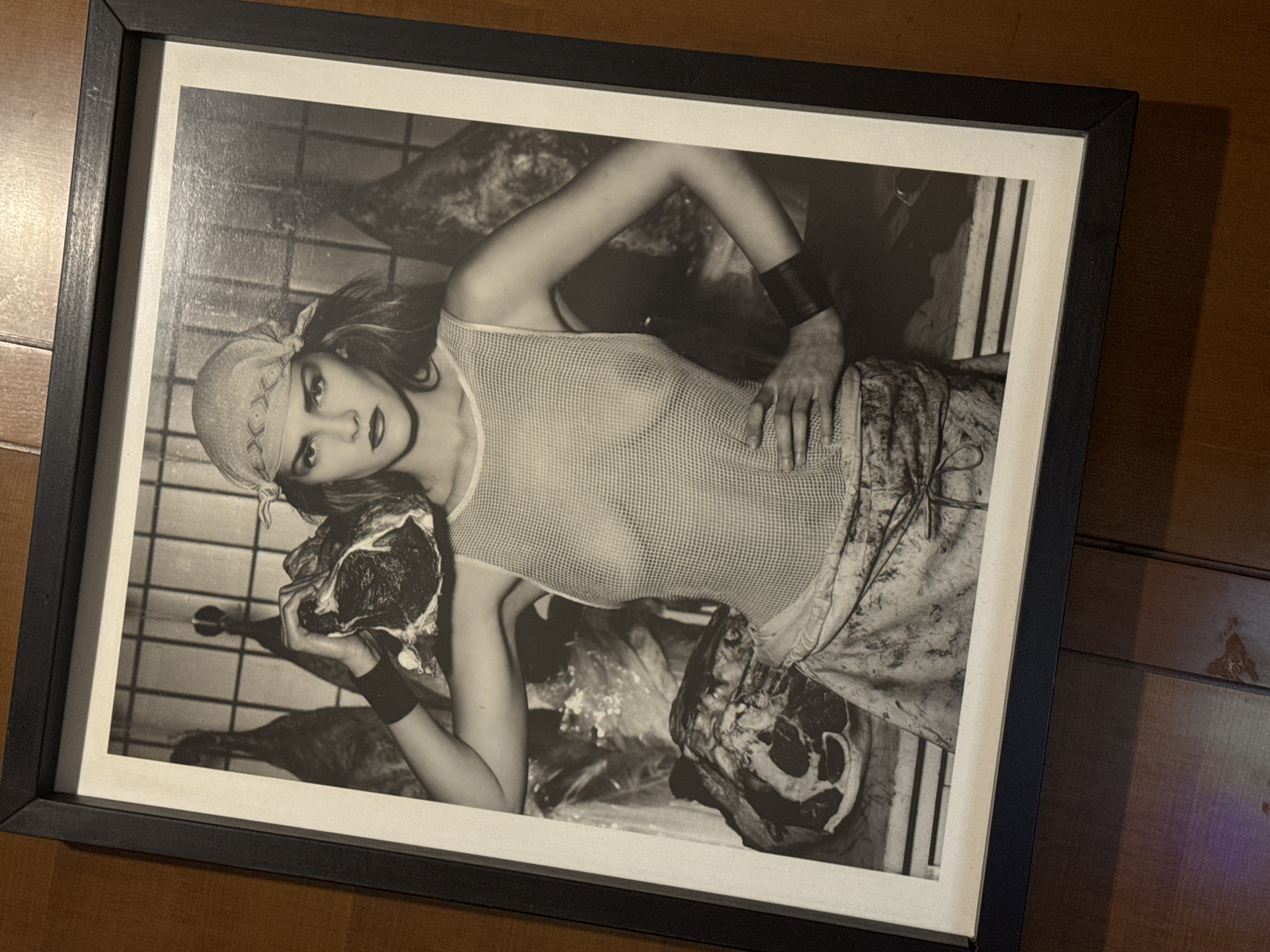 A framed black-and-white photograph depicts a woman in a tank top and bandana, seemingly in a butcher shop. She holds a large piece of meat, possibly beef, close to her face. Other cuts of meat are visible in the background, partially wrapped in plastic. She wears a wide wrist cuff. The setting appears to be a tiled room, suggesting a commercial kitchen or processing area. The overall aesthetic is striking and somewhat provocative.