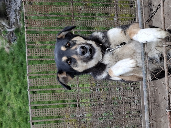The image depicts an outdoor scene in the city of Levski, Bulgaria. A multi-colored dog, featuring black, tan, and white fur, is positioned prominently, standing upright on its hind legs with its front paws resting on the top horizontal bar of a rusted chain-link fence. The dog's face is predominantly black with tan markings above its brown eyes and on its cheeks. Its chest and forelegs are white, with tan accents on its lower legs. A black collar with an attached silver-colored leash clip is visible around its neck. Behind the dog, a second, weathered metal fence composed of vertical bars with small, consistent perforations extends across the midground. The background consists of green grass on the left and a patch of bare soil with a partially visible grey object on the right. No human subjects are present.