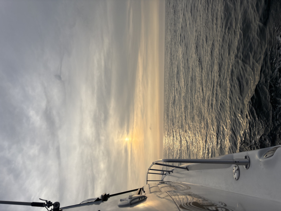 The image depicts a marine scene from the perspective of a vessel at sea, off the coast of Ancón, Peru. The foreground on the left is dominated by the white hull and deck of a boat, angled towards the right, with silver railings extending along its side. Visible on the boat are a metallic fishing rod holder or antenna mounting point in the upper left, and a circular metallic cleat on the deck. The boat appears to be in motion, indicated by the disturbed water alongside its hull in the lower left. The midground and right side of the image show the open ocean, characterized by dark, rippled water with small waves. A distinct, elongated path of golden specular reflection from the sun is visible on the water, extending from the horizon towards the viewer. The horizon line is clear. The sky occupies the upper half of the frame, displaying an overcast condition with varying shades of gray clouds, transitioning to a warm, light yellow-orange hue near the horizon. The sun is visible as a distinct, bright, circular light source slightly above the horizon, positioned slightly left of the image's vertical center, casting a strong glare. No individuals are visible.