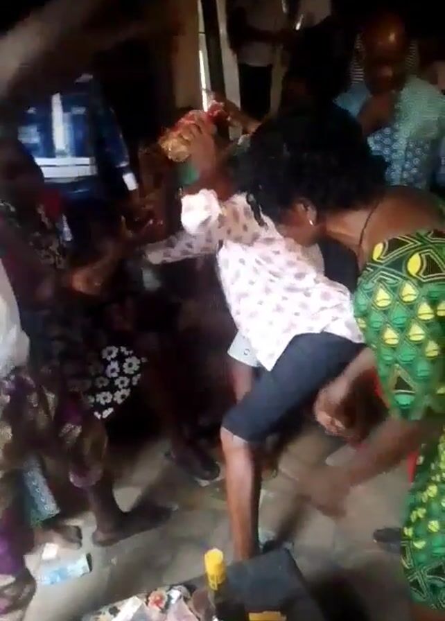 group of about a dozen people in an indoor setting. Several people are actively dancing and gesturing around a woman in a light-colored polka dot shirt and black shorts who is balancing a basket on her head. There is a man in a white shirt and patterned pants dancing enthusiastically to the left. A woman in a green patterned dress is dancing close to the woman with the basket, appearing to guide or support her. Other people are standing around, watching and some recording with their phones. A table with various small items and containers is visible in the foreground. The background is somewhat dark and indistinct, showing doorways and other people. The lighting is dim, and the camera is shaky and moves around, making the scene chaotic.