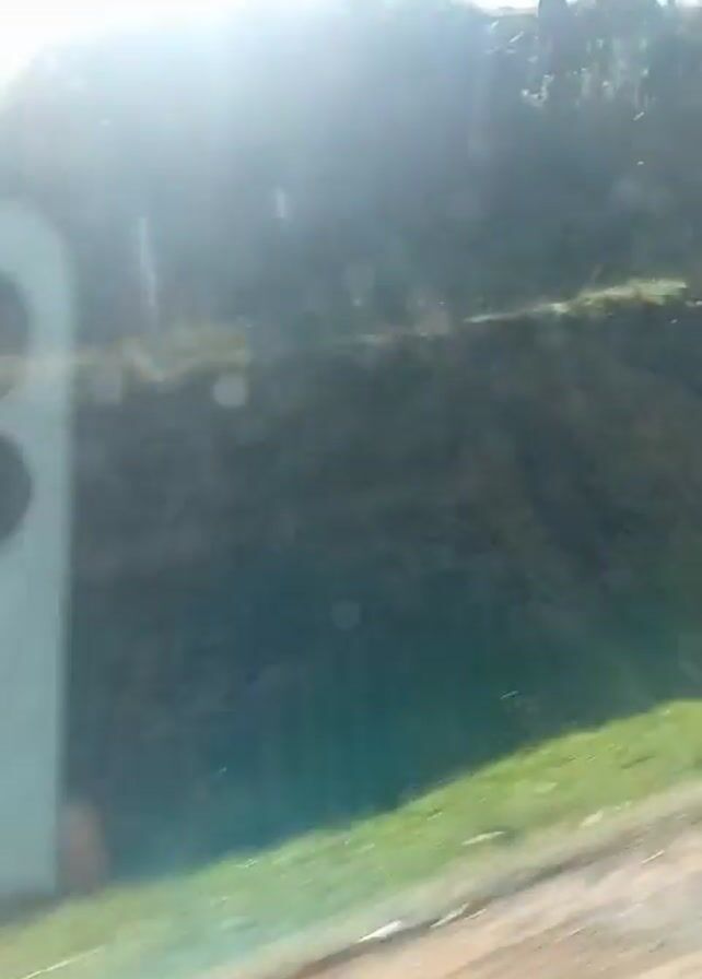 view through a car window, possibly a side window, with sunlight glaring and creating lens flares. The background outside the window shows a blurry scene of green vegetation and possibly trees. In the foreground, partly obscuring the view, is the side of a white or light-colored smartphone, specifically the camera module with three lenses visible. The camera appears to be the focal point for a brief moment. The video appears to have been taken while the car is in motion. Raindrops or water spots are visible on the window.
