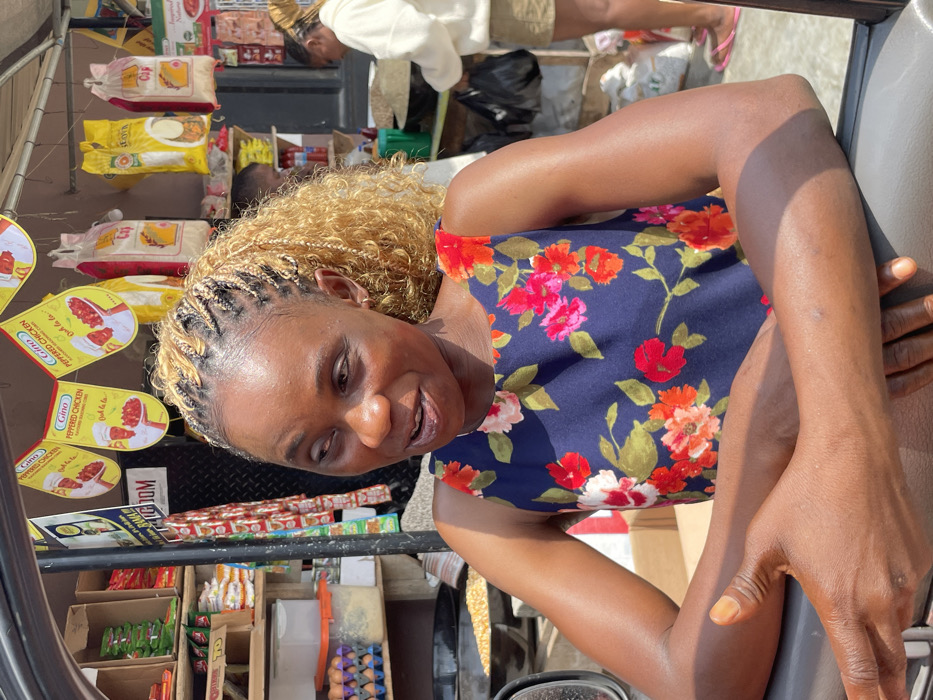 A medium-close forensic image depicts an adult female of dark complexion positioned in an outdoor market setting in Iranla, Nigeria, viewed from the interior of a vehicle. The female subject, centered in the frame, wears a dark blue sleeveless top adorned with red, pink, and green floral patterns. Her hair is styled in blonde braids, partially pulled back into a ponytail. She gazes towards the left of the frame (viewer's right) with her mouth slightly open, indicative of speech or interaction. Her forearms rest on a dark grey vehicle door frame; a portion of a side-view mirror is visible on the far left. The background details an active market stall under bright sunlight. Overhead, multiple yellow, oven-mitt-shaped promotional signs for "Gino Peppered Chicken" are displayed, interspersed with hanging white and yellow sacks of goods, some labeled "Cif" and "SEOWA." To the left, a series of shelves hold various packaged items, including green and white packets, and a blue egg carton containing eggs. Below these shelves, a large black pan filled with yellow kernels, consistent with corn, is visible. Towards the right background, a second individual with dark skin, wearing a light-colored long-sleeved top and shorts, is partially visible, appearing to handle merchandise at the stall. Another figure is partially obscured behind the stall. The environment suggests a commercial area with varied goods for sale.