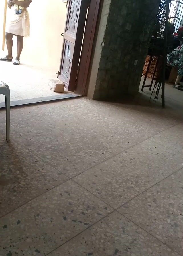 woman standing in an open doorway holding a baby. She's wearing a light-colored dress and sandals. The doorway leads into a room with light-colored walls. To the right of the doorway, inside the room where the video is recorded, there is a wall with a stone-like texture. There are wooden chairs visible in the background on the right, as well as a blue patterned item on the floor. The floor of the room is tiled with grey and brown speckled tiles. There is also a white plastic chair on the left side of the frame. Loud music is playing.