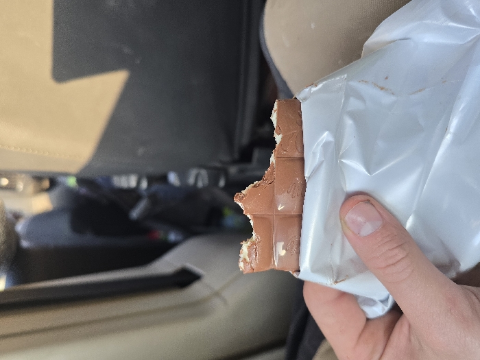 - "A left human hand holds a partially consumed chocolate bar, approximately six segments in length, within a crinkled silver foil wrapper" by FM-IYQQn1, licensed under CC BY 4.0