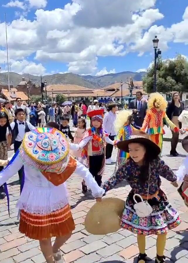 A group of children in colorful costumes dance in a circle in a plaza. The children are holding hands, some are wearing hats, and the costumes are varied. In the background, people are watching, and there are buildings with a church tower visible. Mountains are in the distance under a partly cloudy sky. The ground is paved with brick or stone.