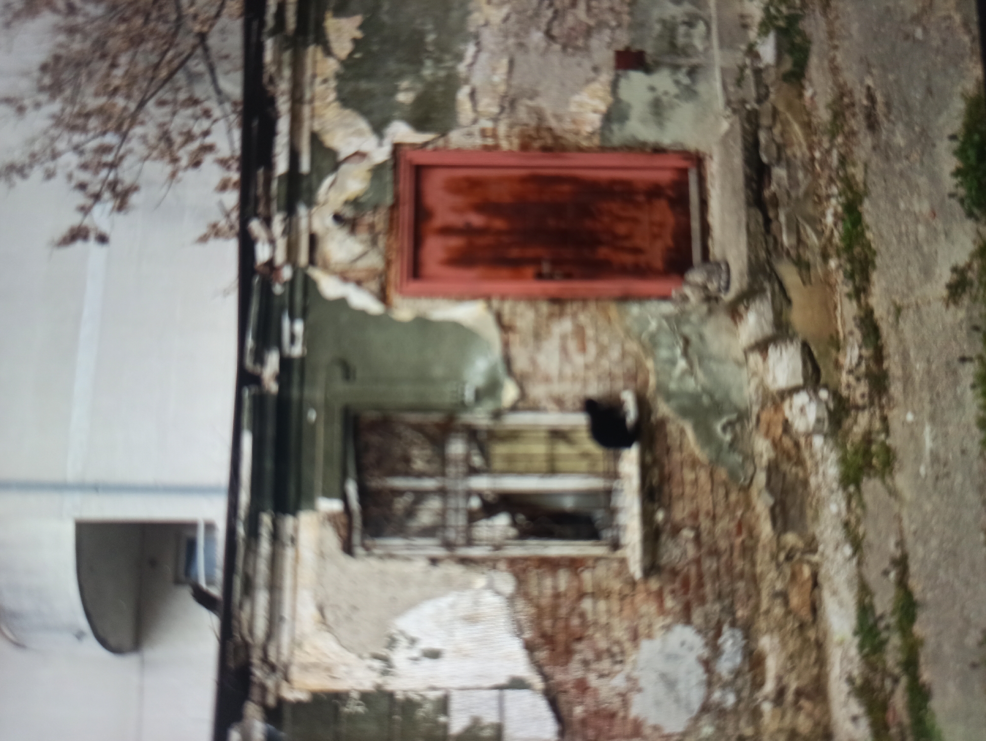 An outdoor scene in Vozdovac Urban Municipality, Serbia, depicts the facade of a severely dilapidated, single-story brick structure in the foreground, contrasted with a modern, light-colored building in the background. The foreground structure features a wall with extensively peeled plaster, revealing red brickwork and patches of crumbling, multi-toned stucco in off-white, green, and grey. To the left, a multi-pane window with a damaged frame and broken glass is visible; a black cat is perched on its windowsill, facing right. To the right, a weathered, reddish-brown wooden door with a visible handle stands slightly ajar or recessed, leading to a dark interior. A light-colored, possibly grey or brown, cat rests on the ground directly in front of this door, near a concrete step or raised platform. The ground immediately in front of the dilapidated building is uneven and composed of rough concrete or dirt, with sparse patches of green vegetation and scattered debris, including broken concrete fragments. Above the foreground structure, a dark horizontal beam is visible, separating it from the upper section of the background building. The background building, a multi-story, light-toned structure, features a distinct curved balcony on its left side. Bare tree branches extend into the upper right portion of the frame, partially obscuring the background building. The overall lighting is diffused, suggesting an overcast day. No human figures are present.