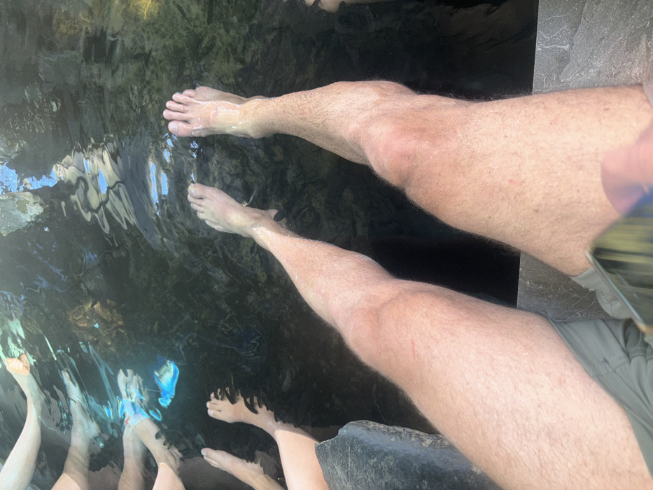 body of water, possibly a pool or hot spring, with multiple sets of human legs and feet immersed