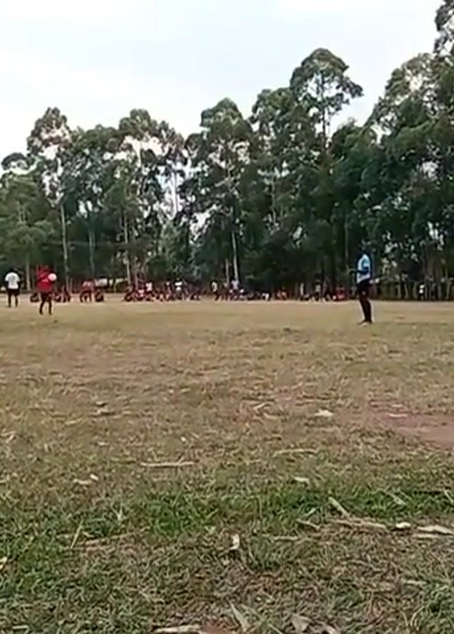 A soccer field surrounded by trees contains a large group of people who appear to be young men, sitting, standing, and walking. One man in a red shirt is dribbling a soccer ball on the field. Another man in a blue shirt appears to be supervising. A dilapidated soccer goal is visible in the foreground.