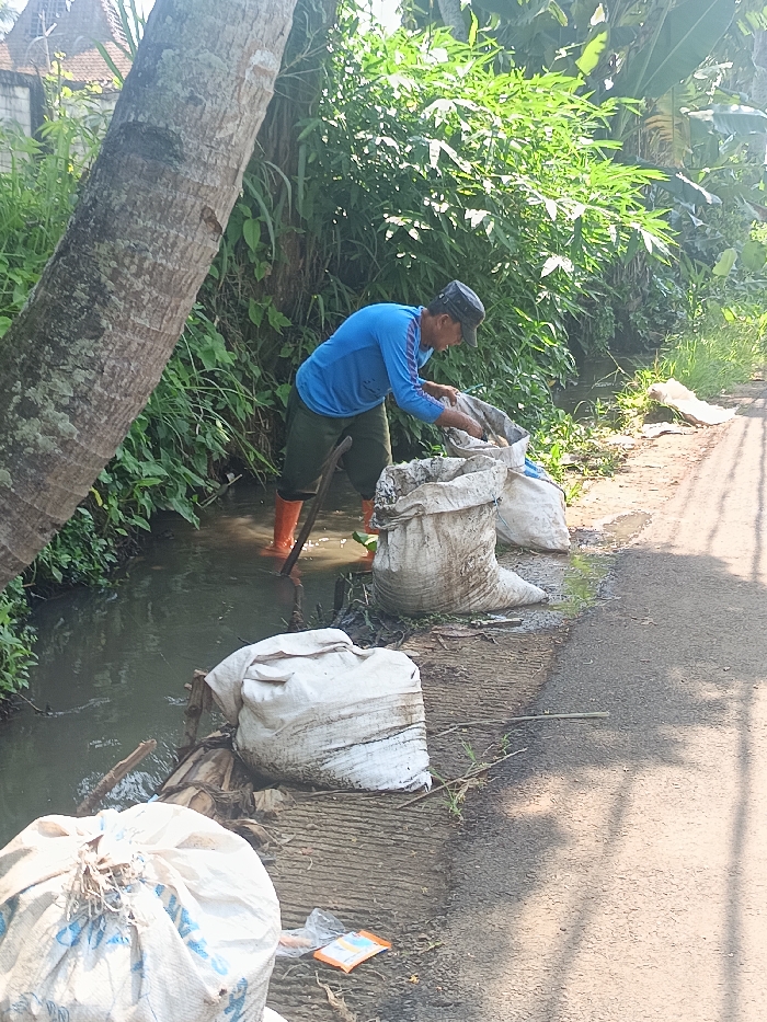 This image depicts an outdoor scene in Sindangasih, Indonesia, under daylight conditions. An adult male is positioned within a shallow, muddy, water-filled ditch, wearing a blue long-sleeved shirt, dark shorts, a dark cap, and orange knee-high rubber boots. He is bent forward, actively handling materials within a large, white woven sack placed on the elevated bank beside the ditch. A dark, stick-like object is partially submerged in the water near his left leg. Multiple similar white woven sacks, some appearing filled, are situated on the ground adjacent to the ditch. Scattered debris, including plant matter and a small plastic wrapper, is visible on the dirt and rough concrete bank. A large, rough-barked tree trunk, possibly a palm, is prominent in the left foreground, angling across the frame. Dense green vegetation, featuring broad-leafed plants, forms the background behind the ditch. Part of a building with a brown roof is partially visible through the foliage in the upper-left background. To the right of the ditch and bank, an asphalt road runs parallel to the scene. The area is brightly lit by sunlight, casting defined shadows.