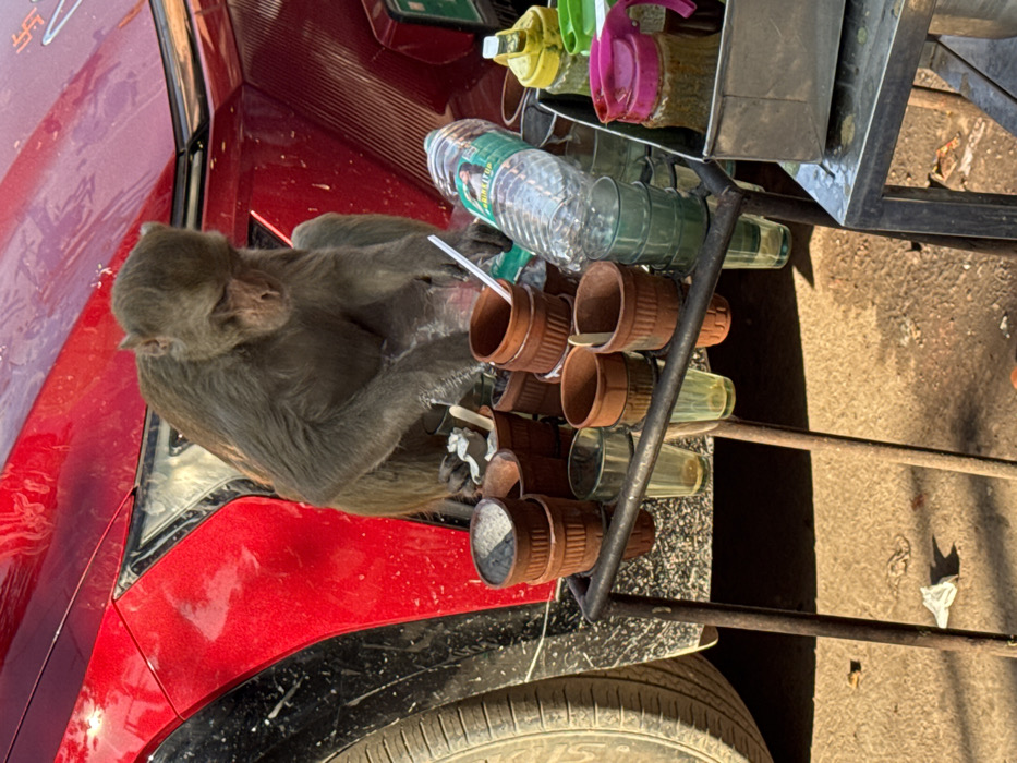 - "An adult Rhesus Macaque is perched on the front fender of a bright red vehicle, intently examining items on a street vendor's stall" by FM-KoaHv1, licensed under CC BY 4.0