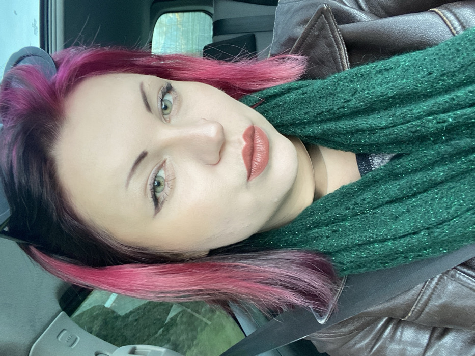 The image depicts a female individual seated within the interior of a vehicle, in what is stated to be the city of Bistrice, Montenegro. The subject is shown from the chest up, facing directly towards the camera, suggesting a selfie. She has fair skin, light green eyes, thin dark arched eyebrows, and prominent winged eyeliner. Her lips are full, slightly pursed, and covered in a terracotta-toned lipstick. Her hair is dark at the roots, transitioning to bright pink/magenta, and is worn down, falling to her shoulders. Dark-lensed sunglasses are perched atop her head. The subject is wearing a dark brown, possibly leather, jacket. Beneath the jacket, a garment with a dark and light speckled pattern is partially visible. Around her neck is a metallic, rigid, gold-toned choker or collar necklace, partially obscured by a textured, emerald green knitted scarf that appears to contain metallic threads. A dark seatbelt diagonally crosses her torso from her left shoulder towards her right hip. The immediate environment shows the interior of a car. The gray headliner and a portion of a sun visor mechanism are visible at the top of the frame. Through the left side window, a blurred outdoor scene with green and gray tones is visible. In the background, through the vehicle's rear windows, the empty back seats and headrests are discernible, with a continuation of the blurred outdoor environment beyond them. The lighting suggests daylight conditions.