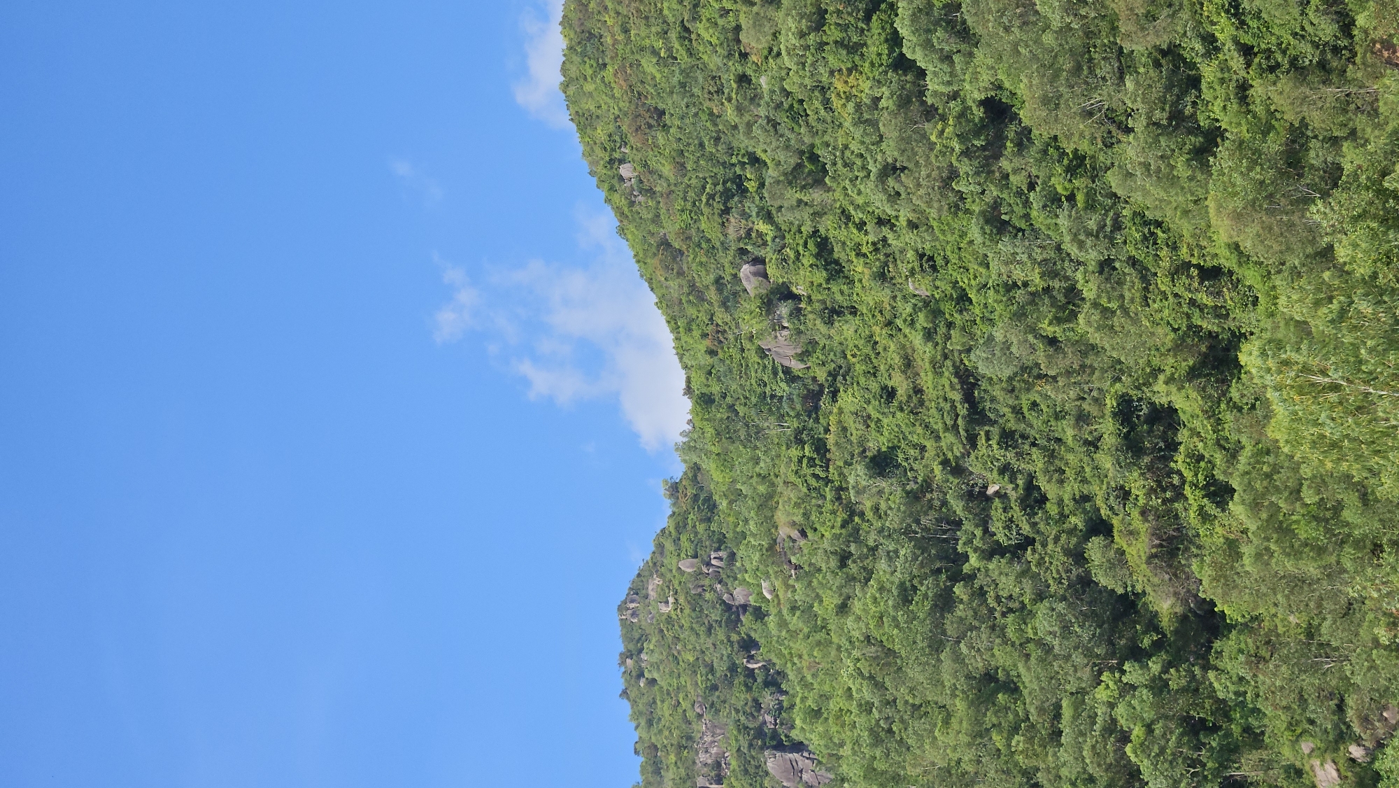 mountain covered in dense green vegetation against a clear blue sky with a few wispy clouds