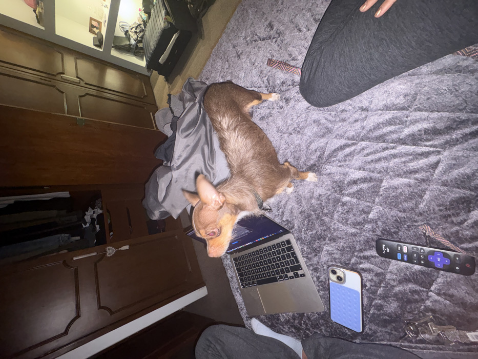 - "On a gray velvet-like bedspread, a brown chihuahua rests on a closed laptop" by FM-FnHOE2, licensed under CC BY 4.0